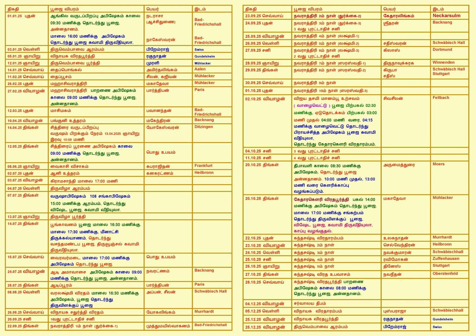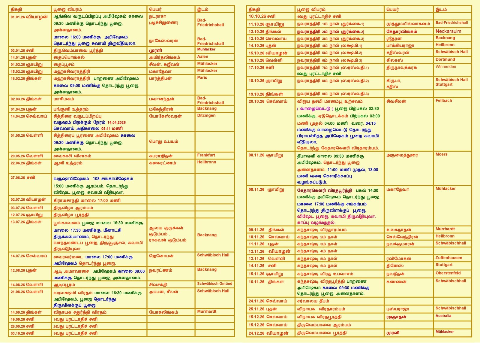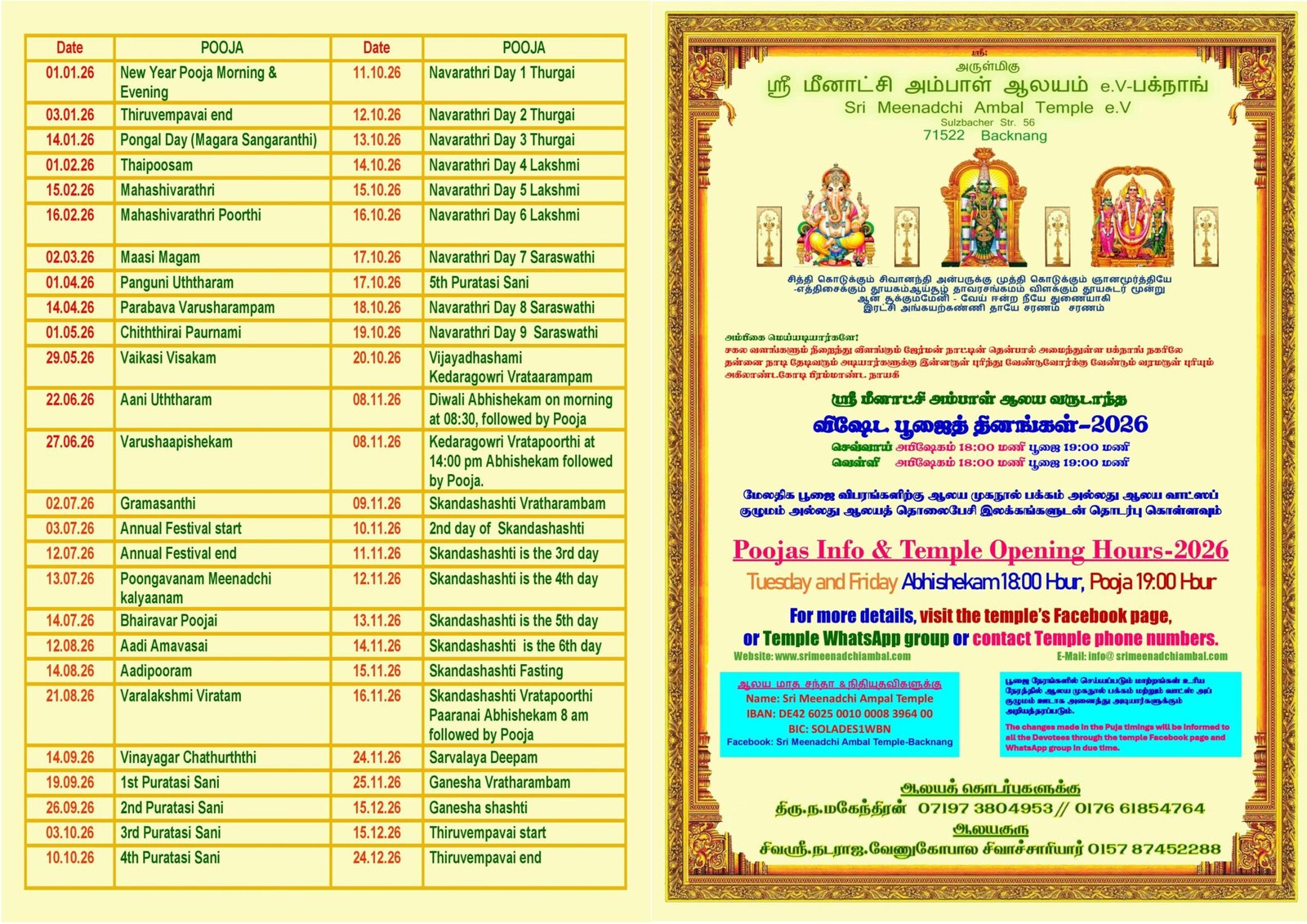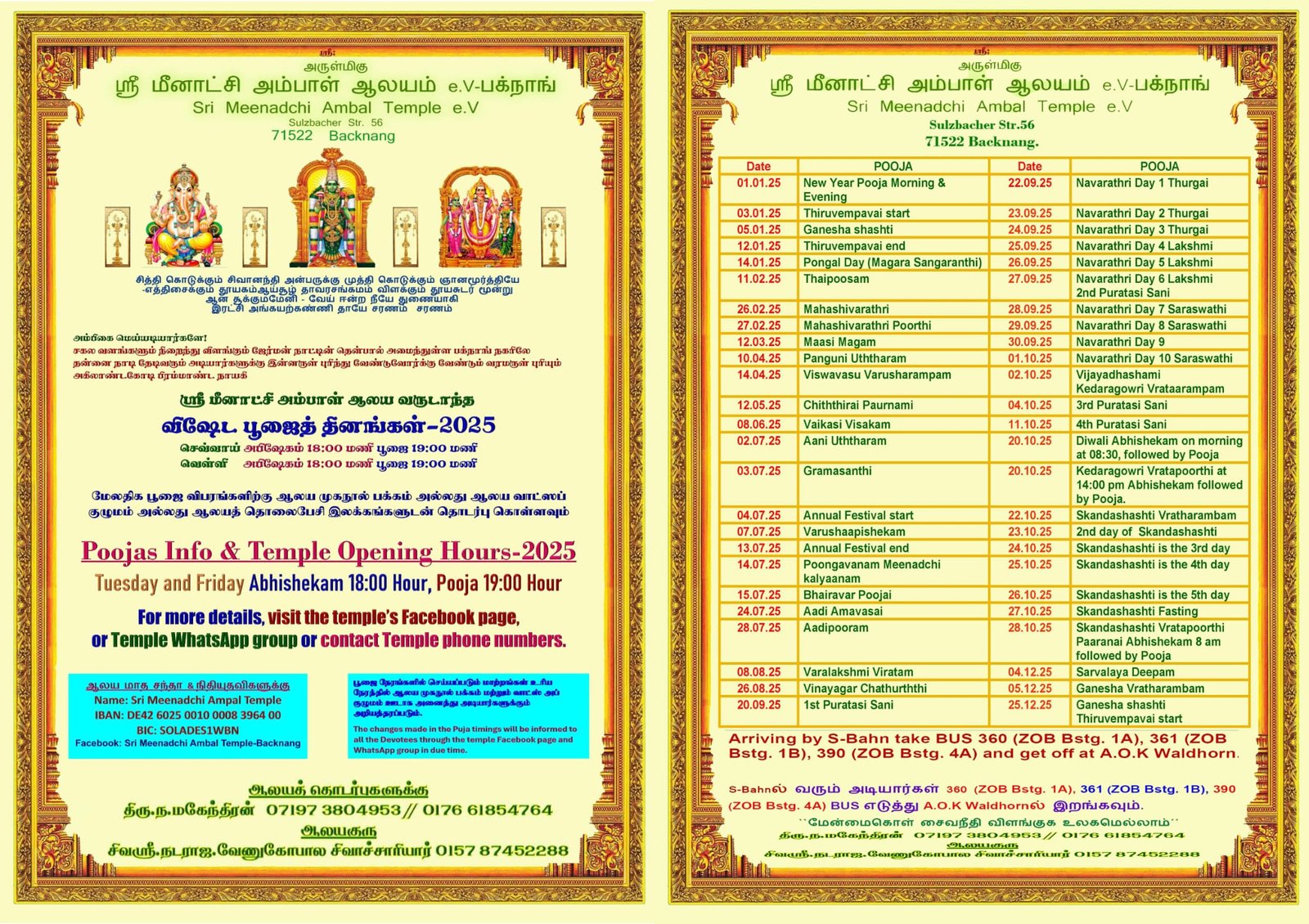 The Sri Meenakshi Ambal Temple in Backnang, Germany, was initiated by Nadarajah Mahendran to preserve Tamil culture and faith. The Sri Lanka Cultural Forum formed on 3 Sept 1993, and the first pooja was held on 27 Mar 1994 by Jagadeeswara Gurukkal.
