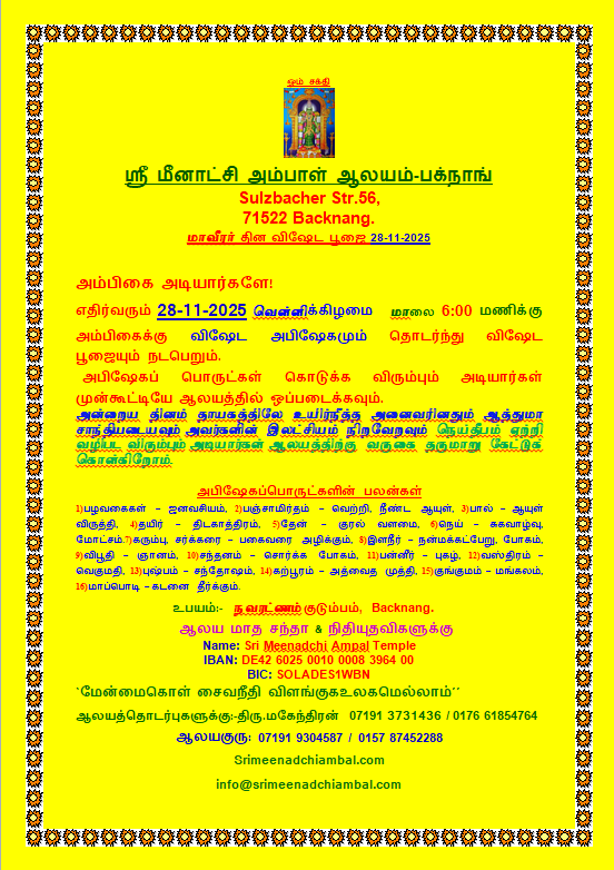 The Sri Meenakshi Ambal Temple in Backnang, Germany, was initiated by Nadarajah Mahendran to preserve Tamil culture and faith. The Sri Lanka Cultural Forum formed on 3 Sept 1993, and the first pooja was held on 27 Mar 1994 by Jagadeeswara Gurukkal.